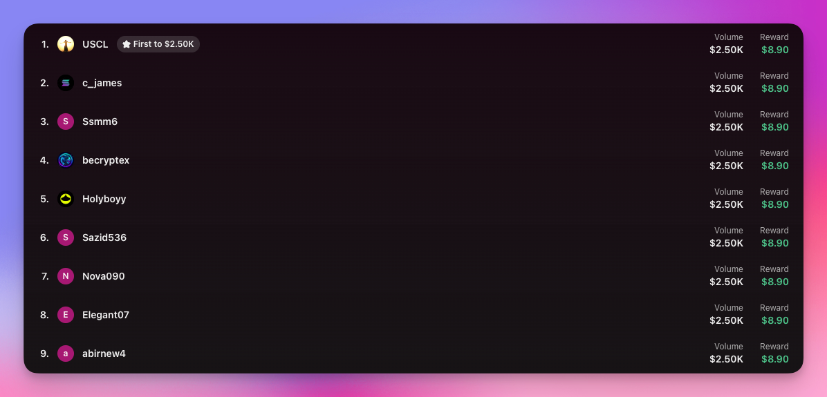 - Rewards distributed daily in proportion to each trader’s share of total volume