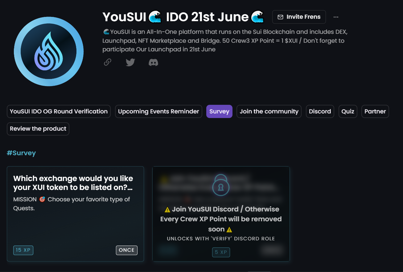 Zealy enables you to reward your members for providing feedback about your product. For example, YouSUI uses surveys to collect feedback, product reviews, token selection, and even the community's favourite Quests.