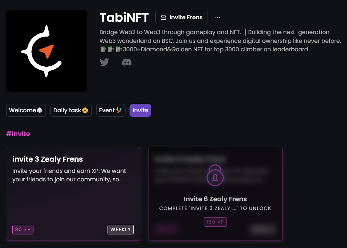 Tabi has enabled Zealy's invite feature for its users to invite their friends to the platform. This is a great way to expand the community of contributors and increase the visibility of your project.