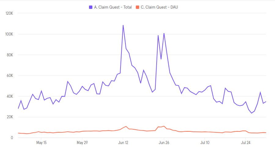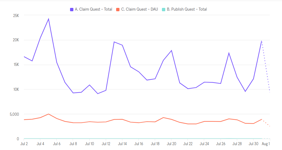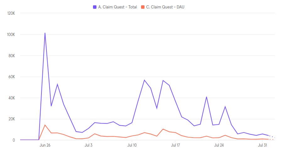 Below is an example of one such community but as you can see, a little over 1 month after the “unicorn run” this community went from 100,000 Daily Quest Claims to less than 5,000 and from 16,000 Daily Active Users (DAU) to less than 900. This translates to a retention of less than 5%.
