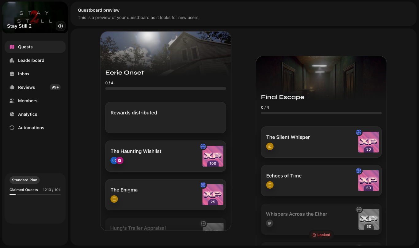 Through our engaging and interactive platform, we drove concrete growth for Stay Still 2's primary conversion metric (Steam Wishlist saves). Personalized gamification for communities at mass scale is the secret behind stickiness and driving meaningful engagement.