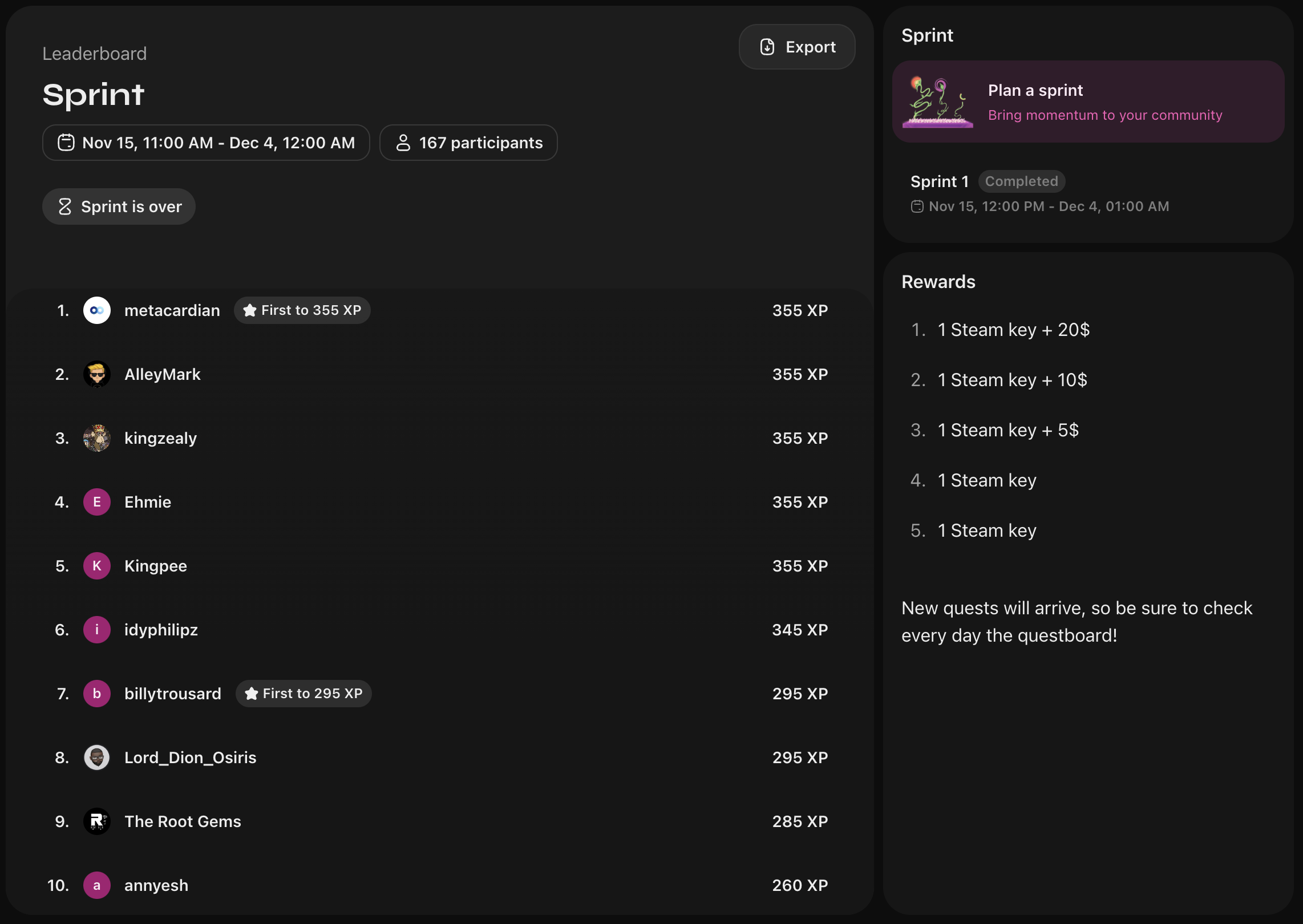 In just two months, the community has grown to 1,500 members, with new users organically discovering the questboard and joining from other communities on Zealy. 49% of users are still accomplishing quests even without an ongoing sprint. This just goes to show how the questboard is generating sustainable organic traction because gamers are always looking for innovative and immersive ways to discover their next game.