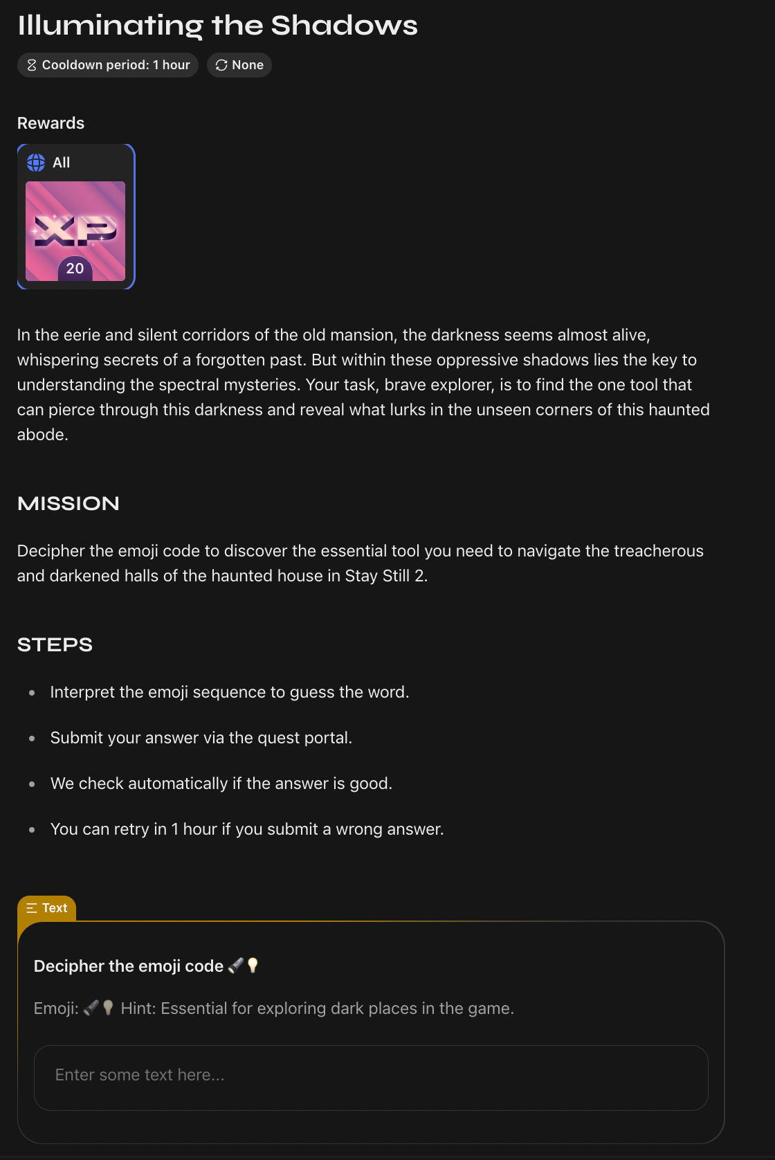 We created a personalized questboard for Stay Still 2 based on the objectives of increasing awareness and engagement. Community members learned about game lore in an immersive setting, while engaging with the game across multiple touchpoints (Discord, Twitter, Steam).