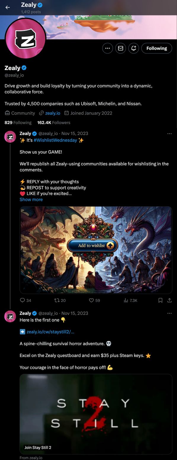 We participated in the #WishlistWednesday trend to announce our launch of the Stay Still 2 Questboard to the gaming community. On X, we reached out to our 160,000 followers for the announcement, reaching an audience 17x bigger than the Galactic Crows X account.