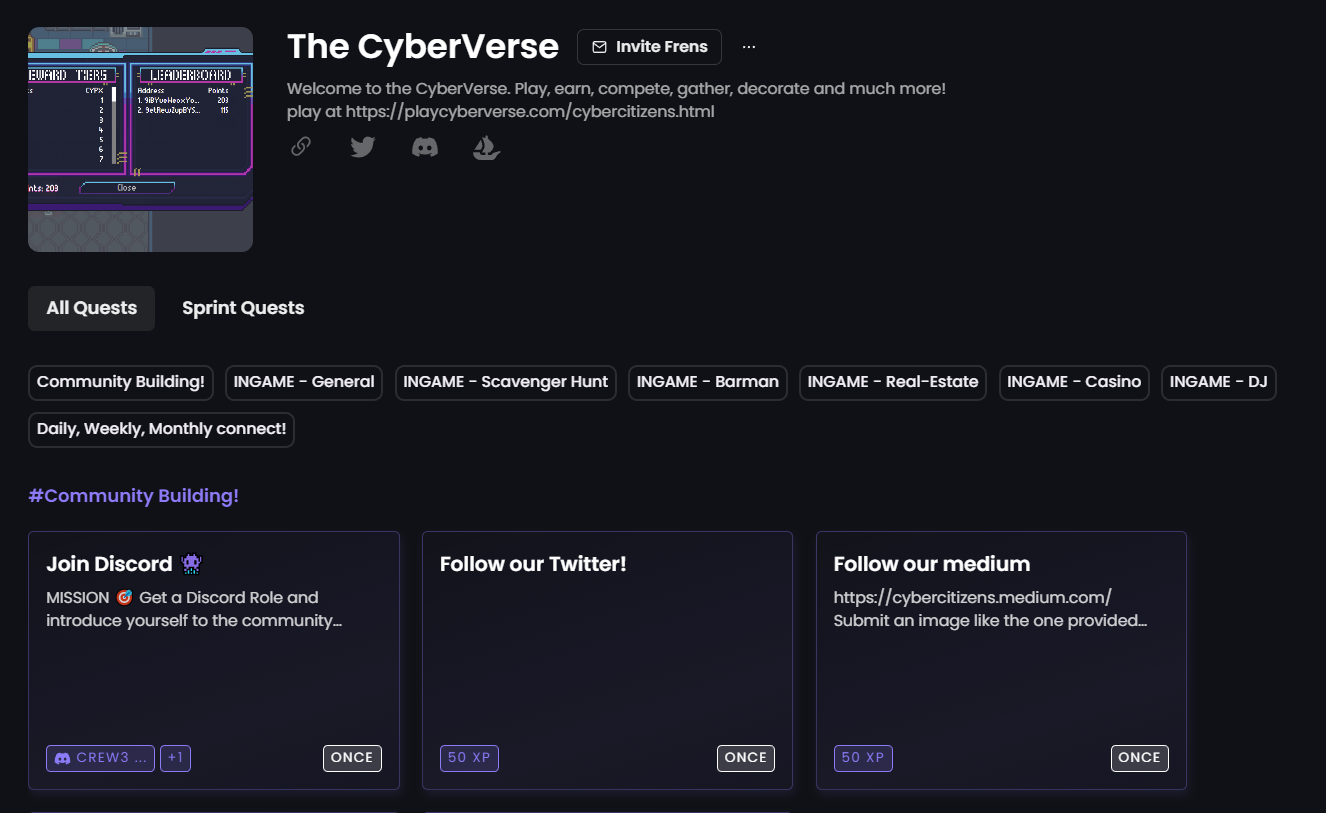 Generally, I like to have all our social channels live and then create Quests for Users to follow our accounts. In CyberCitizens case, Users can join our Discord, Telegram, and follow our Twitter. Once they do it, they can access the daily/weekly Quests and any new ones.